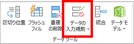 「部署名」を選択するセルを選択し、データタブ > データの入力規則をクリックします。