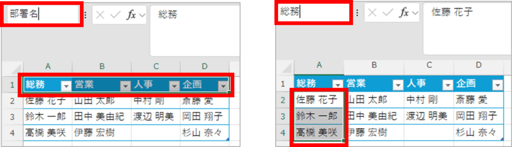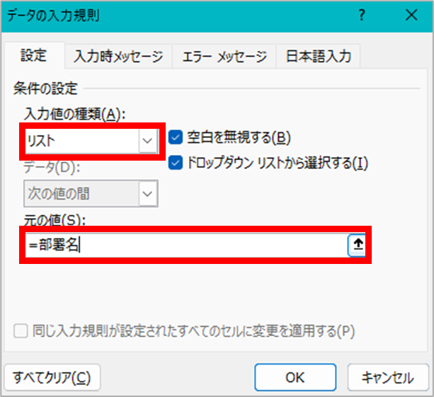 「=部署名」の部分は「名前の定義」で設定した名前を入力します。