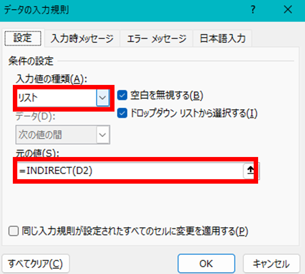 「1つ目の選択肢に応じて、2つ目の選択肢を自動的に変化させる」ためには、INDIRECT関数を活用し、名前の定義と組み合わせてリストの内容を連動させる必要があります。