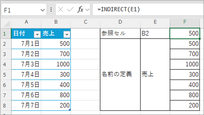 名前の定義:B2~B8セルに「売上」という名前の定義を行っているため、その行数分が表示