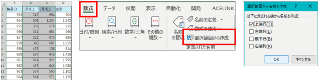 名前を付けたい範囲を選択 > 数式タブ > 選択範囲から作成 > 名前にしたい列がどこにあるかを指定(自動的にチェックが入ります)