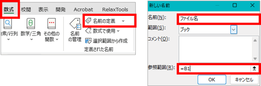 数式タブ > 名前の定義 > 名前・参照範囲を設定