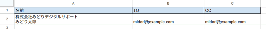 2行目に、実際の送信先情報を入力します。この行のデータをもとに下書きを作成します。