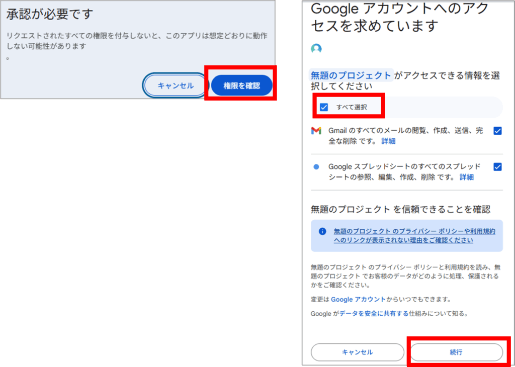 権限を確認 > 自分のアカウントを選択 > すべて選択のチェックを入れ、続行